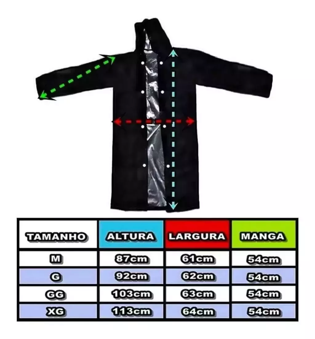 Com forro de poliéster com mangas longas, capuz, fechamento frontal com quatro botões plásticos de pressão.