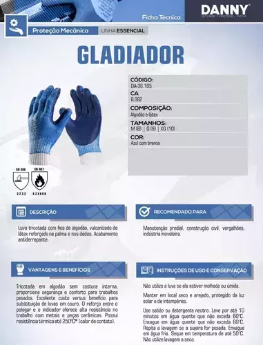A luva gladiador é confeccionada em fios de algodão, vulcanizado de látex reforçado na palma e nos dedos.