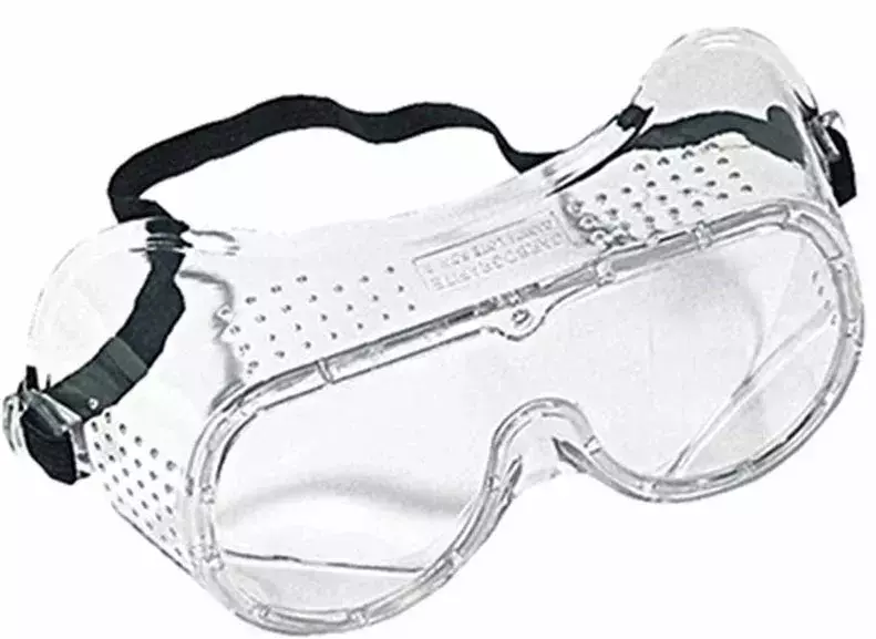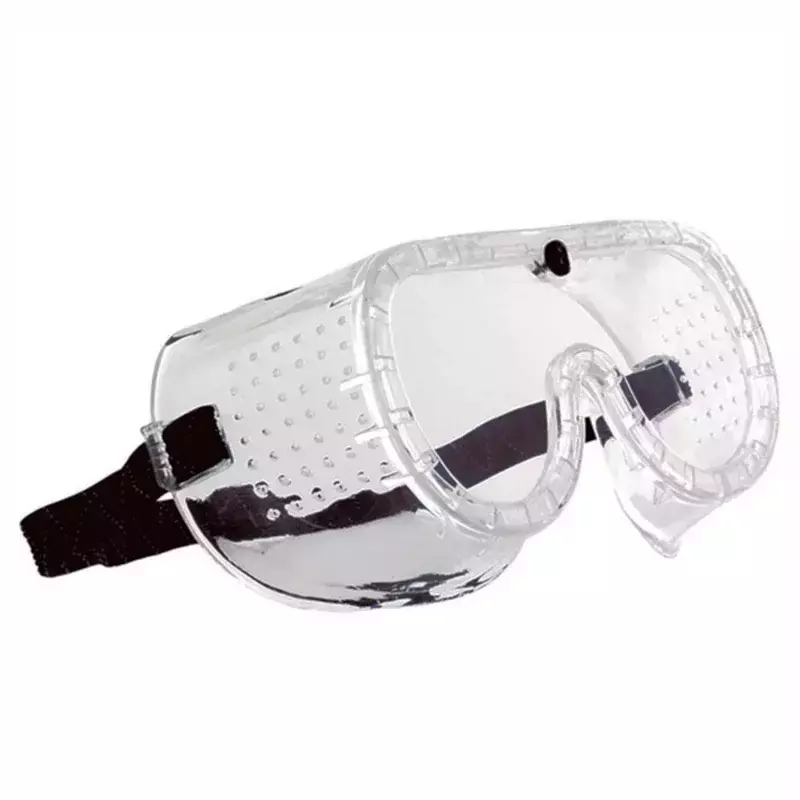 Óculos de proteção com armação em PVC, elástico para ajuste facial, lente em policarbonato incolor e sistema de ventilação indireta através de perfurações laterais.