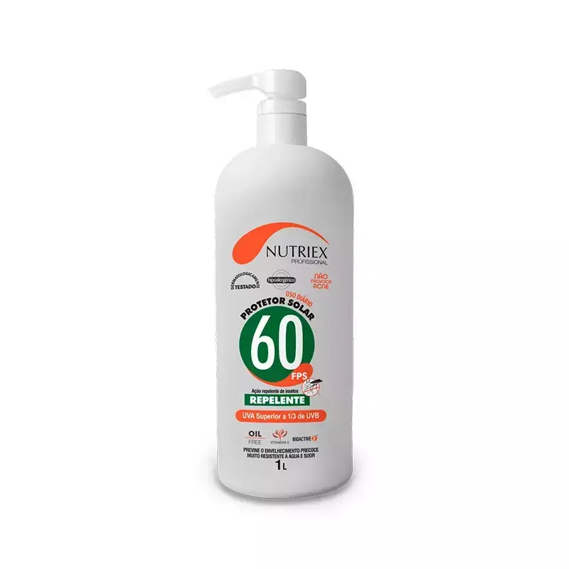 O PROTETOR SOLAR FPS 60 REPELENTE NUTRIEX PROFISSIONAL oferece muito alta proteção à pele contra os efeitos nocivos da radiação solar, prevenindo as queimaduras solares, além de proteger contra os mosquitos. Com toque seco e fácil espalhabilidade, não deixa a pele esbranquiçada e possui aplicação rápida e prática. Contém Bioactive E®, poderoso antioxidante que previne o envelhecimento precoce. Além disso, minimiza os danos na pele causados pelos raios infravermelhos devido à ação antioxidante do produto. RÁPIDA ABSORÇÃO, TEXTURA LEVE, NÃO COMEDOGÊNICO, LIVRE DE CORANTES, AÇÃO HIDRATANTE. Efetivo na proteção contra os mosquitos Aedes aegypti, Culex quinquefasciatus, e Anopheles sp. Uso Profissional.