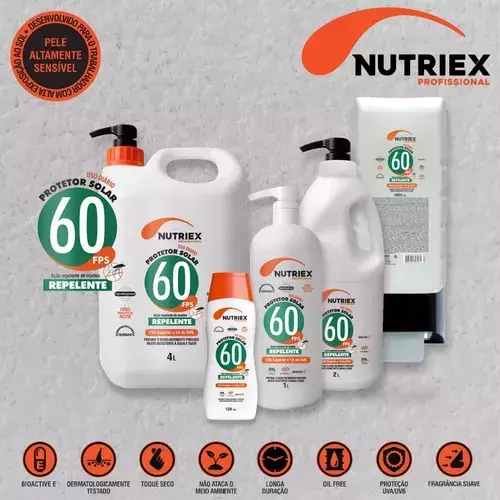O PROTETOR SOLAR FPS 60 REPELENTE NUTRIEX PROFISSIONAL oferece muito alta proteção à pele contra os efeitos nocivos da radiação solar, prevenindo as queimaduras solares, além de proteger contra os mosquitos. Com toque seco e fácil espalhabilidade, não deixa a pele esbranquiçada e possui aplicação rápida e prática. Contém Bioactive E®, poderoso antioxidante que previne o envelhecimento precoce. Além disso, minimiza os danos na pele causados pelos raios infravermelhos devido à ação antioxidante do produto. RÁPIDA ABSORÇÃO, TEXTURA LEVE, NÃO COMEDOGÊNICO, LIVRE DE CORANTES, AÇÃO HIDRATANTE. Efetivo na proteção contra os mosquitos Aedes aegypti, Culex quinquefasciatus, e Anopheles sp. Uso Profissional.
